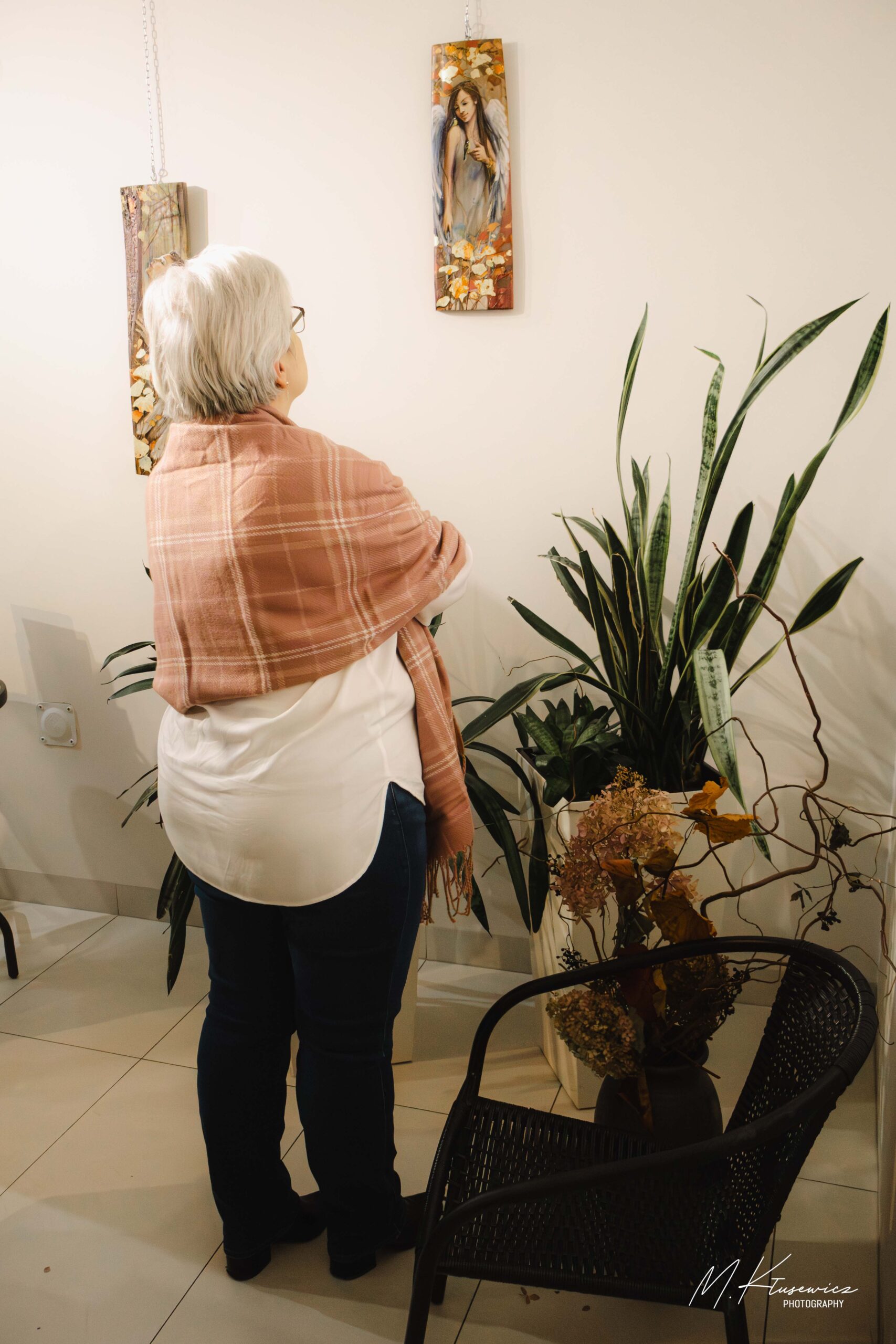 Elżbiety Stelmaszuk, malowane na drewnie kwiaty, ptaki z babcinych ogródków oraz ulotne anioły, stworzyły nastrojową, wyciszającą atmosferę, która pozwoliła na refleksję i własną interpretację każdej z postaci.