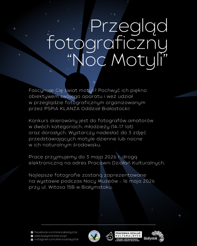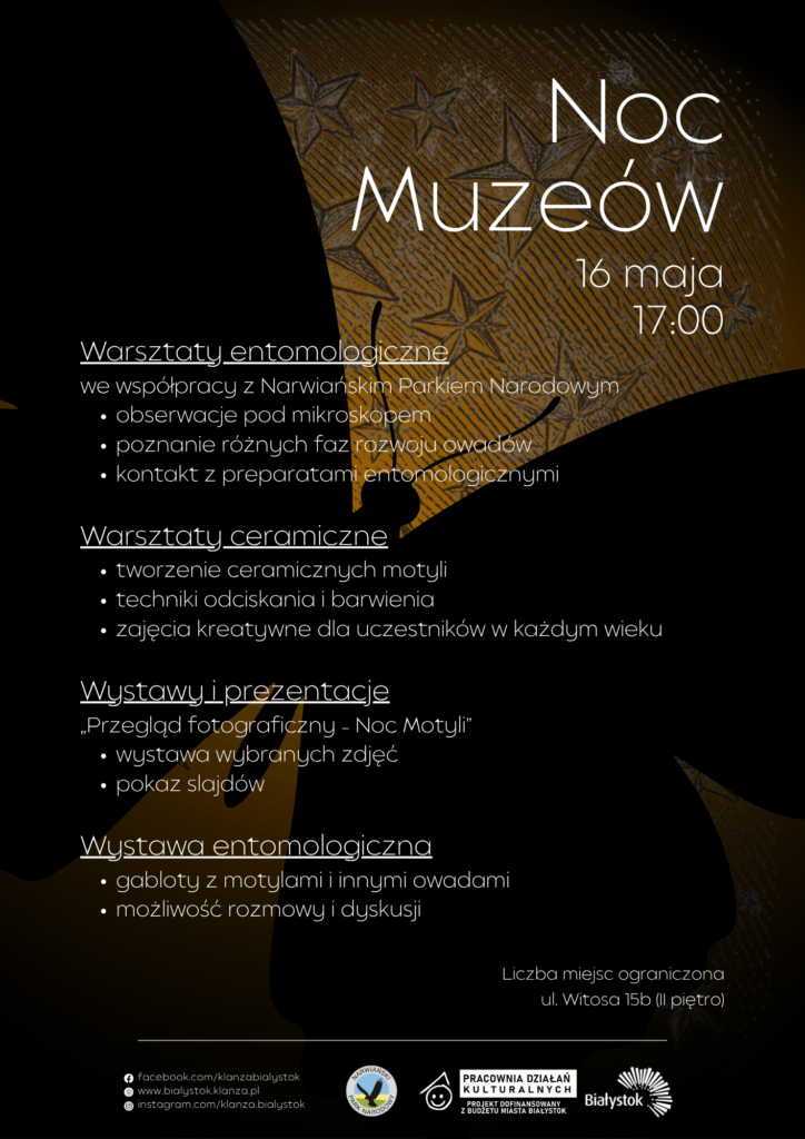Podczas Nocy Motyli zapraszamy na otwarcie wystawy fotograficznej, będącej efektem przeglądu poświęconego motylom – dziennym i nocnym, uchwyconym w ich naturalnym środowisku.